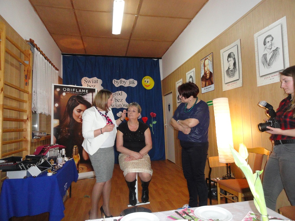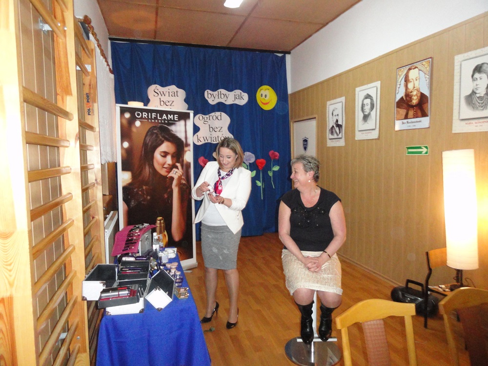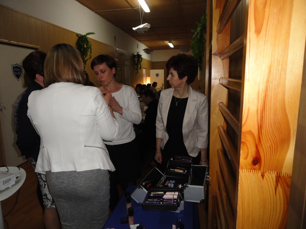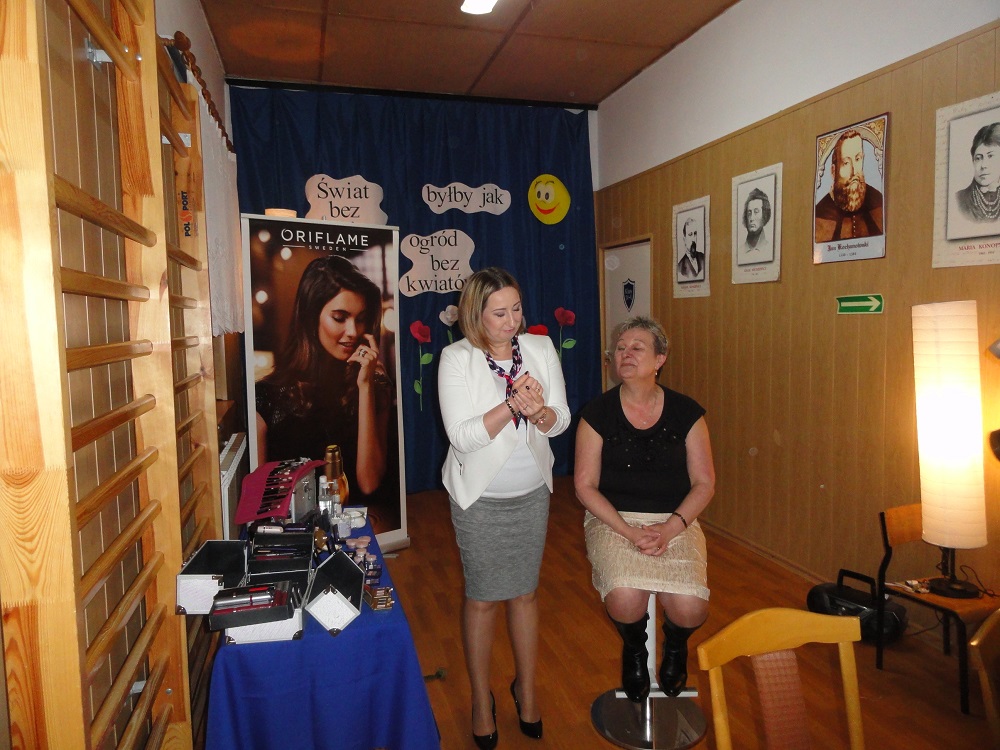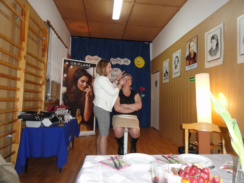 Druga część spotkania upłynęła na zabawie i przyjemnościach. Panie skorzystały z zabiegów pielęgnacyjnych, a całość uświetnił pokaz makijażu w wykonaniu Pani Agnieszki Krzemińskiej – Dyrektora Klubu Oriflame w Piotrkowie Tryb. Zaproszone panie kosmetyczki, rozwiewając wątpliwości, burząc stereotypy i budując prawidłowe nawyki kosmetyczne, podzieliły się wśród kobiecego grona praktyczną wiedzą udzielając indywidualnych konsultacji na temat pielęgnacji ciała. Nie obyło się też bez „pachnących upominków”. I tu należą się słowa podziękowania sponsorom : radnemu Rady Gminy Gorzkowice - Panu Stefanowi Woźniakowi oraz Pani Elżbiecie Komar - przedstawicielowi ubezpieczeniowemu z Sobakówka.