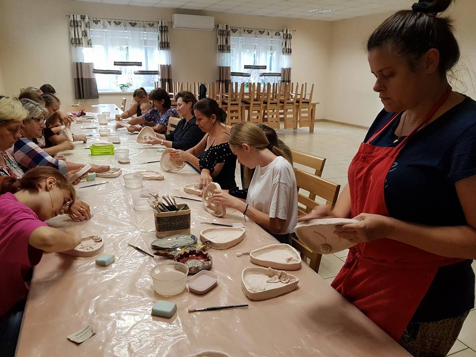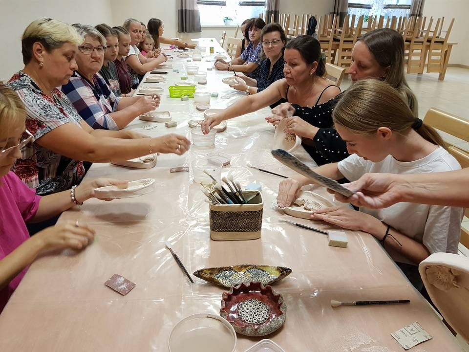 W świetlicy wiejskiej w Szczukocicach odbyły się warsztaty malowania na tkaninie oraz drugi etap warsztatów ceramicznych. Uczestnicy nanosili motywy ludowe na tkaninę – elementy ubioru lub lniane torby oraz szkliwili wcześniej wykonane misy. Warsztaty zostały przeprowadzone w ramach zadania pt. „Folkowy zawrót głowy” współfinansowanego ze środków Powiatu Piotrkowskiego.