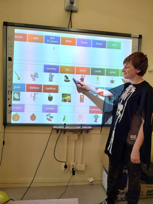 Od samego rana szkolne korytarze przemierzały czarownice, czarne koty, superbohaterowie, diabły i inne postacie ubrane w różnego rodzaju stroje, maski i akcesoria. Nie zabrakło oczywiście popularnej Wednesday Addams, Harry’ego Pottera, Frankensteina, a nawet Velmy z serii seriali i filmów o Scooby Doo. Można śmiało powiedzieć, że wszyscy wyglądali „strasznie” pięknie! Podczas zajęć języka angielskiego dzieci zdobywały wiedzę o kulturze krajów anglojęzycznych poprzez naukę o zwyczajach związanych z Halloween, poszerzały słownictwo związane z tym tematem, a także rozwiązywały karty pracy, których motywem przewodnim było oczywiście to święto. Hasłem dnia było powiedzenie „Cukierek albo psikus!”, które zaowocowało tym, że na koniec dnia wszyscy wyszli ze szkoły z łakociami w plecakach.